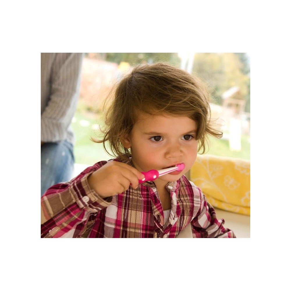 Clean your teeth like an adult! The First Brush allows babies to easily imitate the way that adults clean their teeth. This means that babies learn to clean their teeth correctly from day one.
