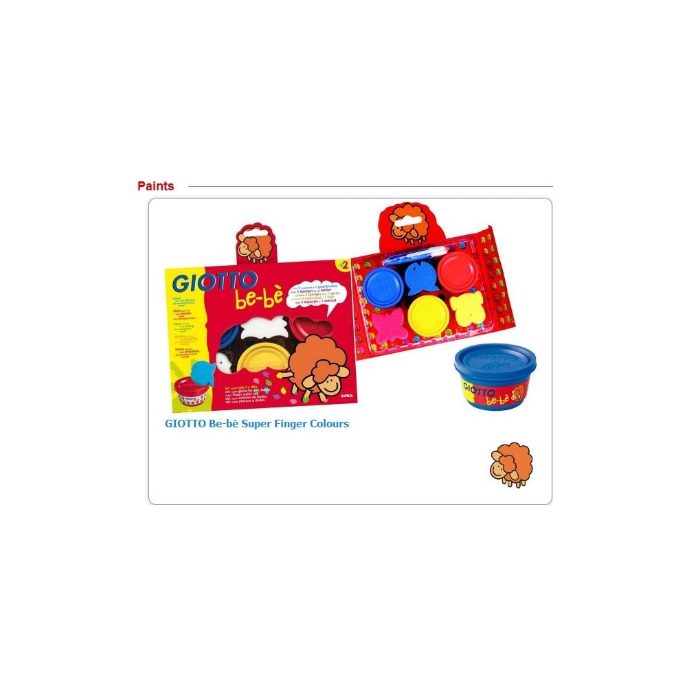 Available in a set of 3 x 100ml pots of colours (red, cyan and yellow), 3 fun-shape sponges and a Giotto Be-bè printed plastic apron.